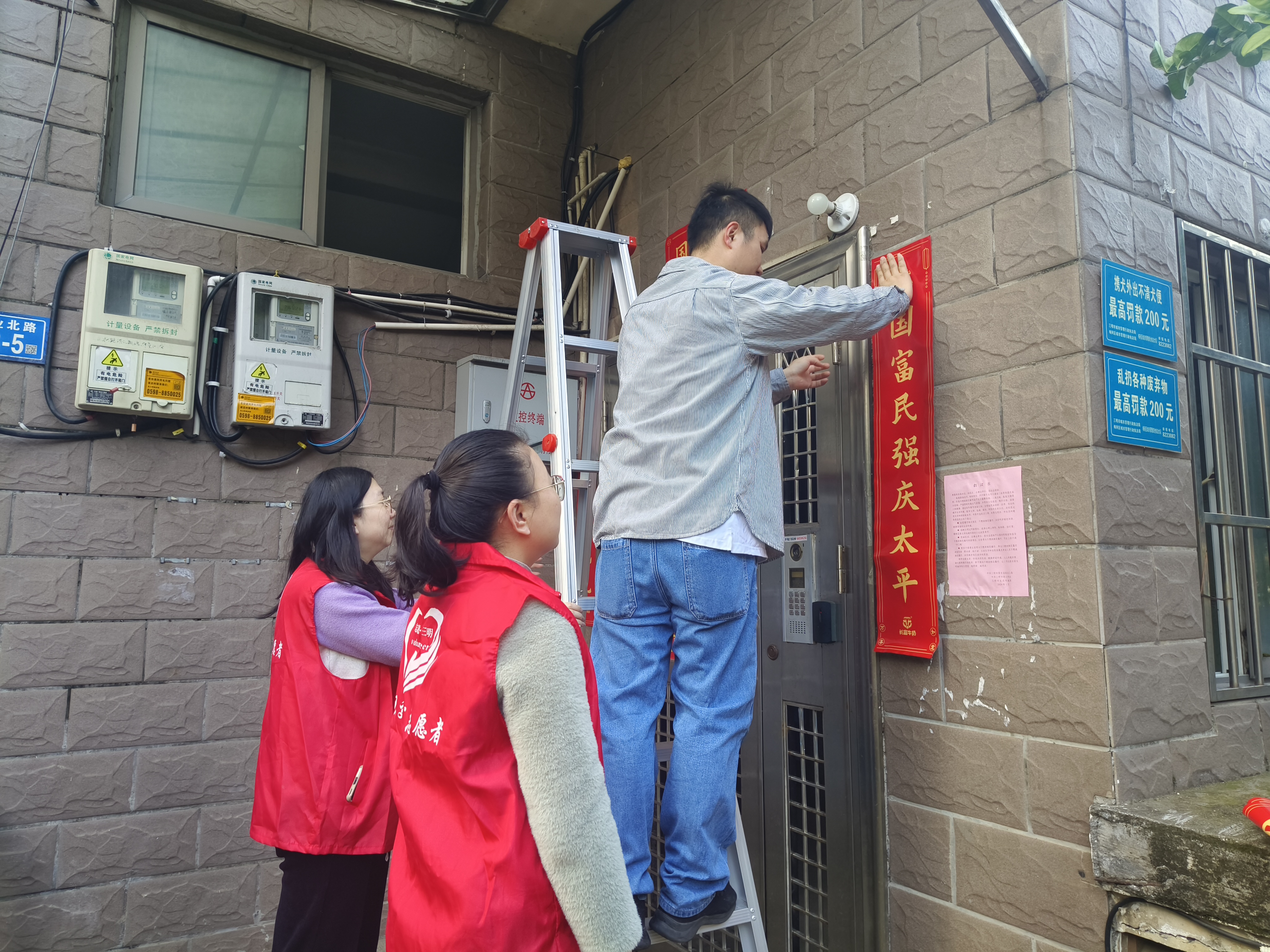 活動現(xiàn)場,黨員志愿者們配合物業(yè)公司分工明確開展新春布置工作,有的在單元樓貼春聯(lián)、有的清除舊年貼畫、有的清理樓道垃圾。一時間小區(qū)熱鬧非凡,年味漸濃,紅紅的春聯(lián)對仗工整,美好寓意的“?!弊指吒哔N起,過道干干凈凈面目一新,贏得小區(qū)業(yè)主的一致稱贊。