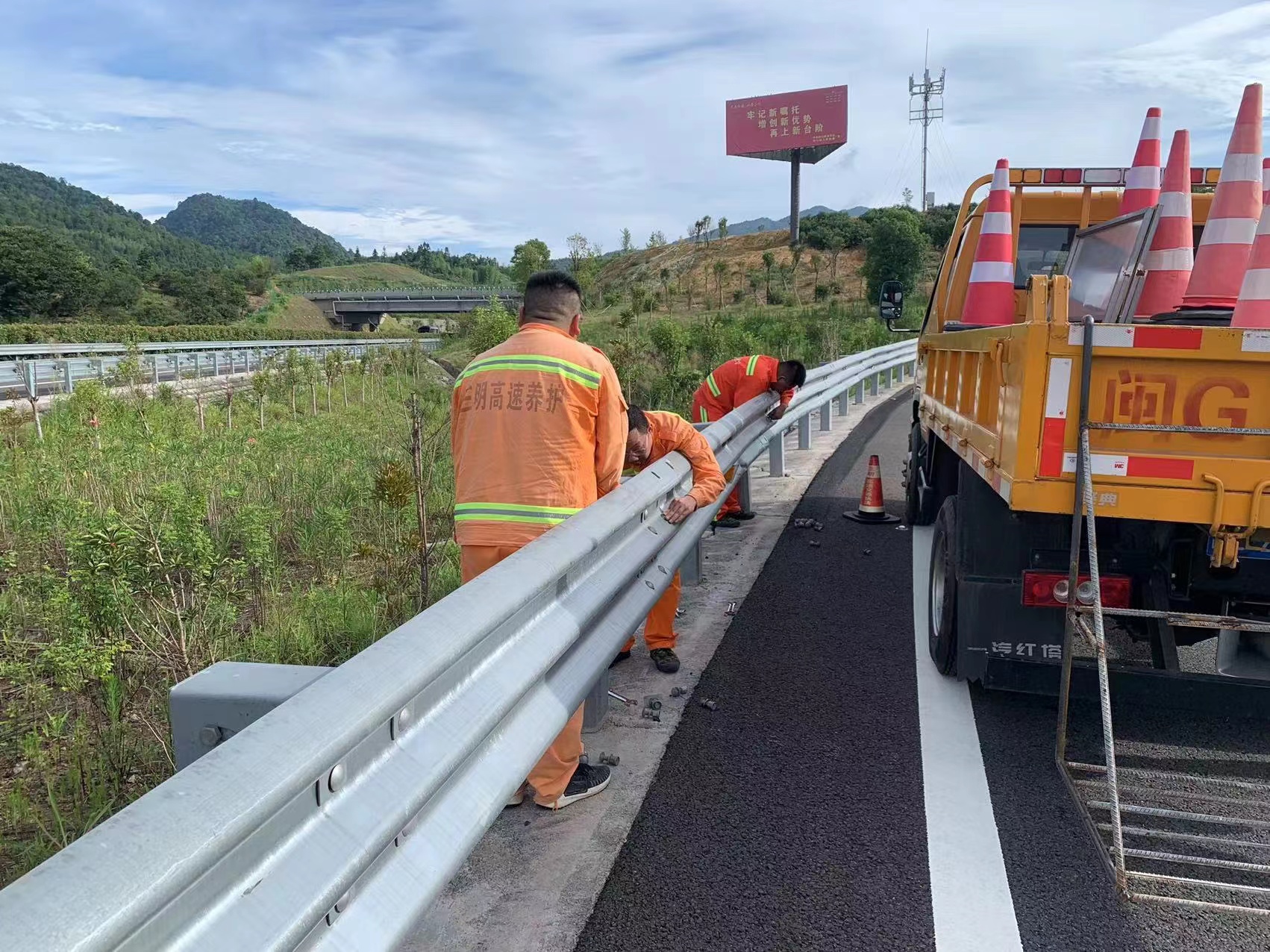 高溫“烤”驗高速養(yǎng)護人的初心,汗水澆灌著他們的使命。“特別能吃苦、特別能戰(zhàn)斗、特別能奉獻”詮釋著高速養(yǎng)護人的實干與擔當。那抹橙色,在“汗蒸”的高溫天里白天藍云映襯下格外耀眼,成為高速公路上一幕幕靈動的風景。