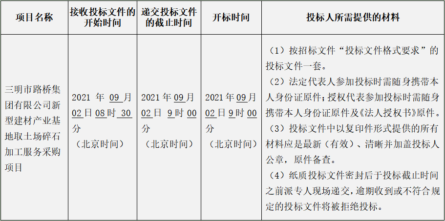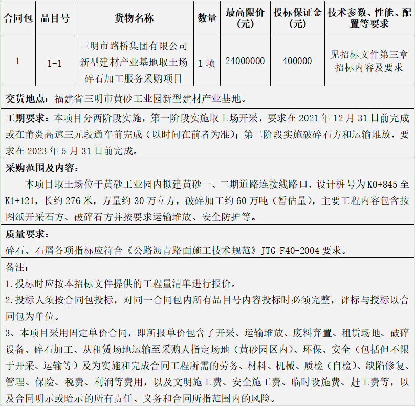 本公司受三明市路橋集團有限公司的委托,就其所需的三明市路橋集團有限公司新型建材產(chǎn)業(yè)基地取土場碎石加工服務(wù)采購項目進行公開招標(biāo),歡迎符合條件的供應(yīng)商參加投標(biāo)。