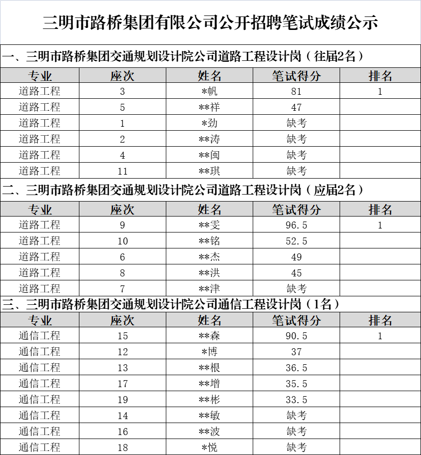 市路橋集團公開招聘筆試環(huán)節(jié)已于2022年4月19日完成,現(xiàn)將筆試成績予以公示: