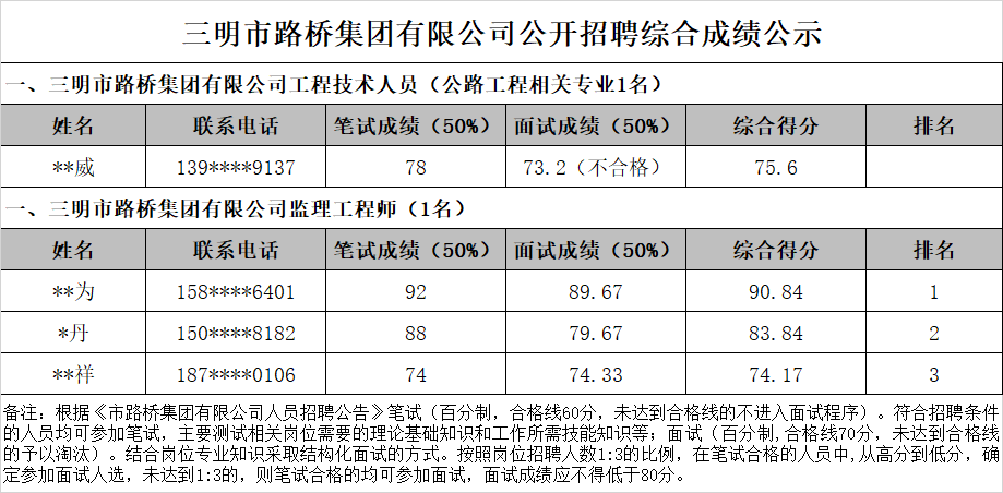 根據(jù)《市路橋集團(tuán)有限公司人員招聘公告》,現(xiàn)將市路橋集團(tuán)有限公司公開招聘工作人員綜合成績及排名情況公示如下: