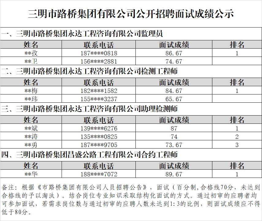 三明市路橋集團(tuán)有限公司項(xiàng)目用工人員招聘面試環(huán)節(jié)已于2025年5月29日完成,現(xiàn)將面試成績(jī)予以公示: