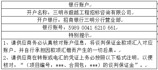 6.2采購文件發(fā)售地點(diǎn):三明市超越工程招標(biāo)咨詢有限公司(地址:三明市三元區(qū)東乾路192號(匯鑫大廈)2606號)購買或?qū)①徺I費(fèi)用轉(zhuǎn)賬至以下賬戶: