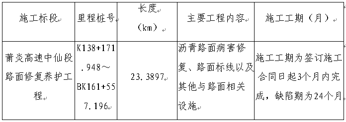 本遴選項(xiàng)目莆炎高速中仙段路面修復(fù)養(yǎng)護(hù)工程勞務(wù)協(xié)作建設(shè)資金來源為業(yè)主支付款,遴選人為三明市路橋集團(tuán)昌盛公路工程有限公司。本項(xiàng)目已具備遴選條件,現(xiàn)對(duì)該項(xiàng)目進(jìn)行庫內(nèi)遴選,并向三明市路橋集團(tuán)有限公司工程施工勞務(wù)班組庫(公路工程類)內(nèi)單位以電子郵件形式發(fā)出通知。