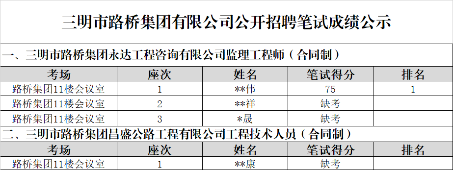市路橋集團(tuán)有限公司公開招聘筆試成績(jī)公示